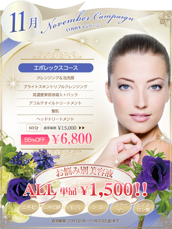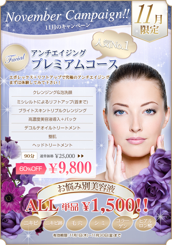 11月のキャンペーン☆/広尾・恵比寿でアンチエイジングからO脚矯正まで♪フェイシャル&トータルビューティーはCielplendir~シエルプランディー~