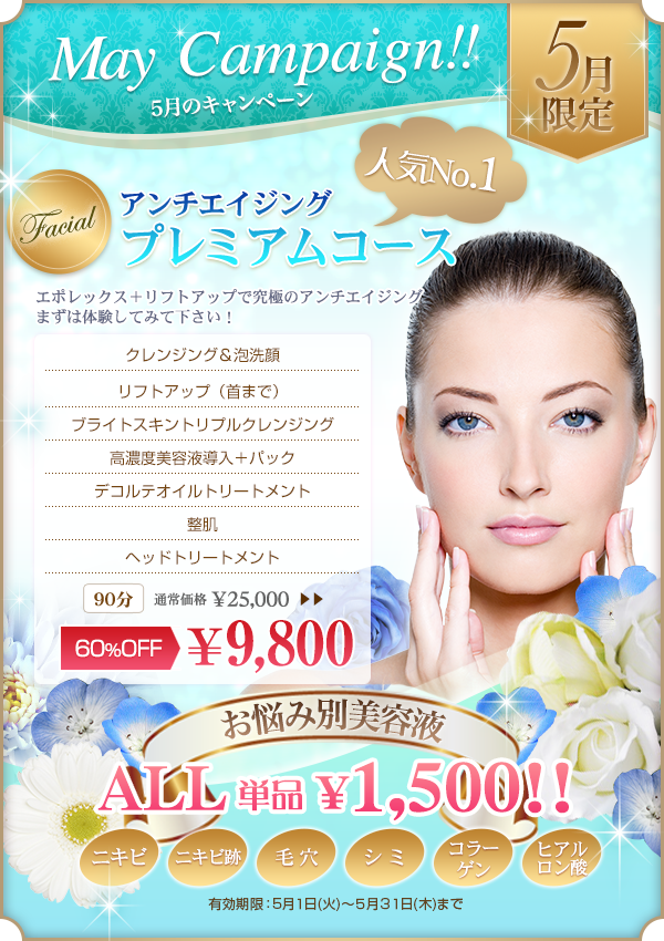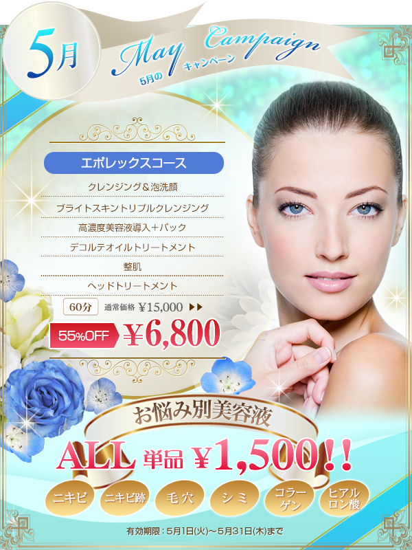 5月のキャンペーン☆/エポレックス専門フェイシャルエステサロンは恵比寿・広尾のCielplendir~シエルプランディー